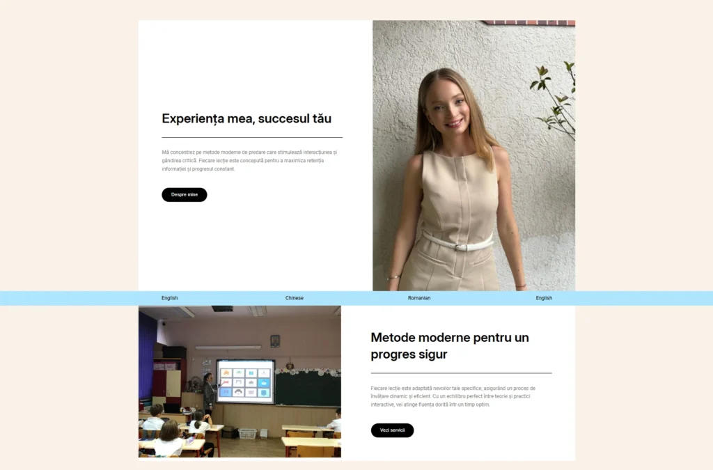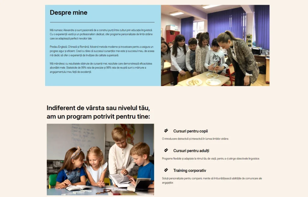 Designul este modern, dar accesibil, cu secțiuni esențiale: despre noi, tipuri de cursuri, metode de lucru, testimoniale și formular de contact. Am pus accent pe ton prietenos, imagini autentice și call-to-action-uri vizibile, astfel încât părinții sau reprezentanții firmelor să găsească rapid ce au nevoie și să ia legătura ușor.