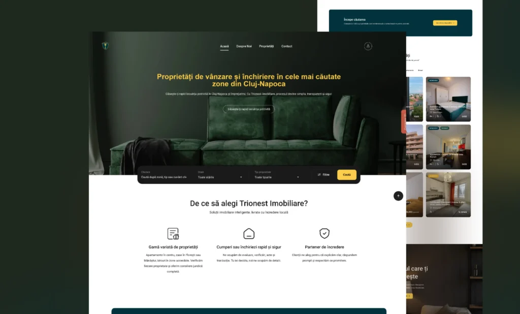 Pentru Trionest Imobiliare am conceput un website clar, elegant și funcțional, menit să reflecte profesionalismul unei agenții care activează pe una dintre cele mai dinamice piețe din țară: Cluj-Napoca. Obiectivul a fost simplu: o prezență digitală care să atragă vizitatorii și să-i transforme în clienți hotărâți.